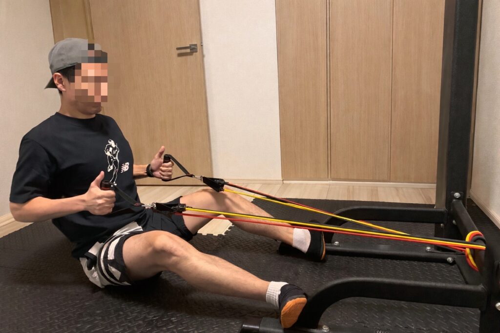 続いてチューブ・シーテッドローで背中を追い込んでいきます。懸垂とは異なる「横に引く動き」で背中を刺激していきます。僧帽筋を意識したシーテッドローで、背中の厚みを作っていきましょう。