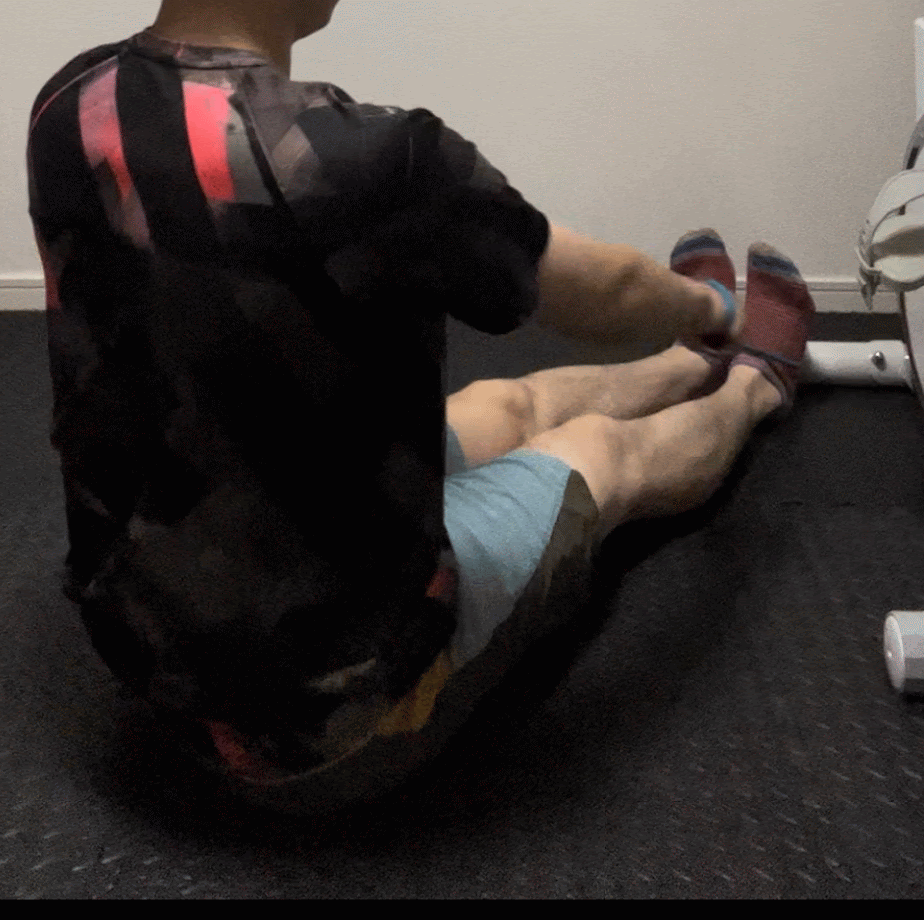 疲れてくると猫背になりやすいので注意が必要。「腰から丸める」のはNGです。背筋を伸ばし、肩甲骨を寄せることを意識しましょう。反動を使わないように注意し、丁寧に行っていきましょう。また、もも裏が固い人は、体制をキープしづらいかもしれません。もも裏のストレッチなどを行い、柔軟性を高めると動作がやりやすくなります。