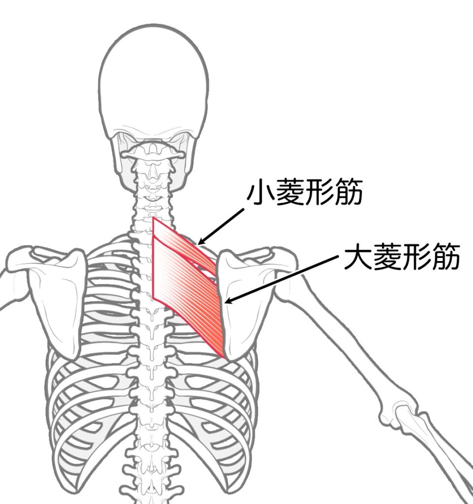 菱形筋は肩甲骨の内側に位置し、肩甲骨を中央に引き寄せる働きを持つ筋肉です。