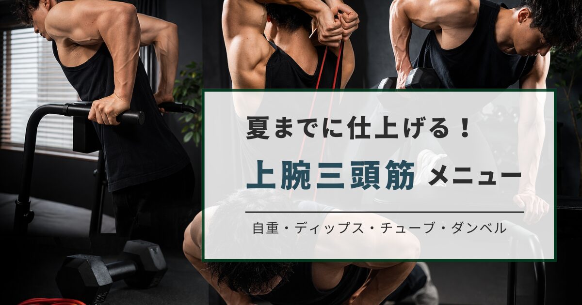 ここからは「器具なし」、「チューブ」、「ダンベル」を使ったトレーニングといった形で網羅的に上腕三頭筋を鍛える方法について紹介していきます。